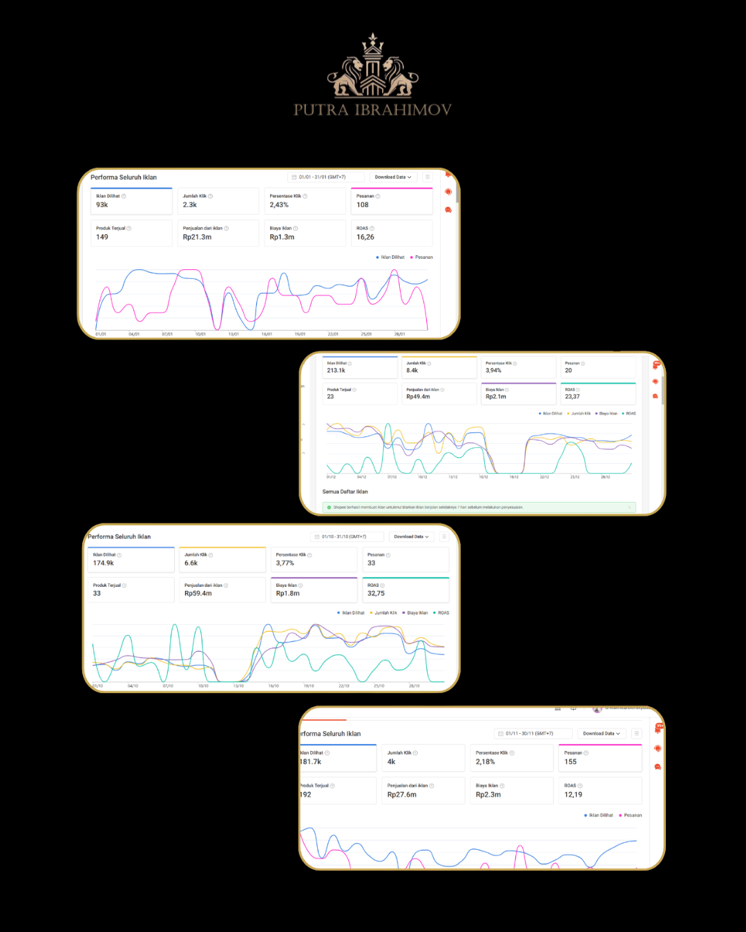 Mendapat kepercayaan mengelola brand Pie Susu Dewata Agung asal Bali di Shopee, saya melakukan optimasi etalase melalui penerapan SEO, penataan visual yang menarik, serta pengelolaan iklan berbasis data. Hasilnya, omzet naik signifikan hingga 68% di bulan pertama dan bertambah 15% di bulan berikutnya, membuktikan bahwa strategi digital yang terukur mampu membawa pertumbuhan nyata bagi brand lokal di pasar kompetitif..